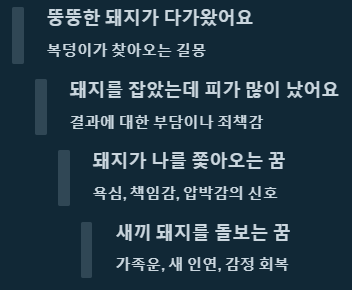 | 돼지에게 쫓기는 꿈 | 감정 과부하, 과욕, 조절 필요한 상태 | 흉몽 |
