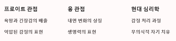프로이트는 피가 흐르는 꿈을 욕망과 긴장감의 배출로 보았고, 융은 생리와 같은 상징을 내면 변화와 생명력의 표현이라 해석했어요