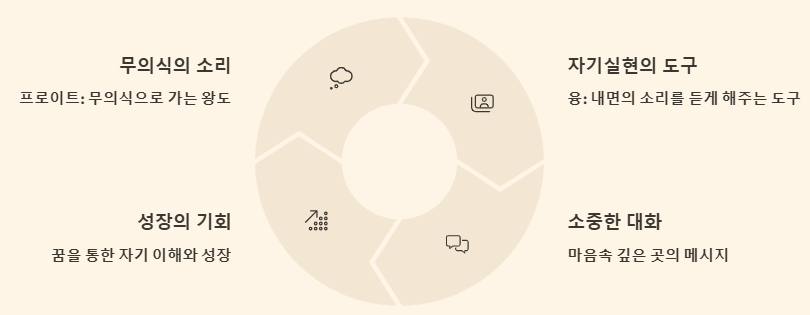 프로이트는 꿈을 '무의식으로 가는 왕도'라고 했고, 융은 꿈이 우리 내면의 소리를 듣게 해주는 자기실현의 도구라고 말했습니다. 이처럼 꿈은 단순히 잠자는 동안 꾸는 허상이 아니라, 우리 마음속 깊은 곳의 메시지를 담고 있는 소중한 대화입니다.