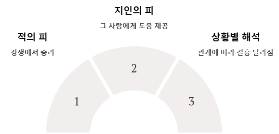 예를 들어, 적의 피를 보았다면 경쟁에서 승리하거나 어려움을 극복할 징조로 봅니다. 반대로 지인의 피를 보았다면 그 사람에게 도움을 주거나, 그 사람의 어려움이 당신에게 영향을 미칠 수 있음을 나타낼 수 있어요.