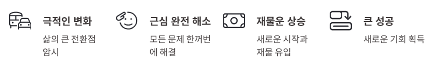 오랫동안 당신을 괴롭히던 문제들이 한꺼번에 해결되거나, 새로운 시작과 재물운이 따를 징조입니다. 때로는 큰 성공을 거두고 모든 것을 새롭게 시작할 기회를 얻게 될 수도 있습니다.