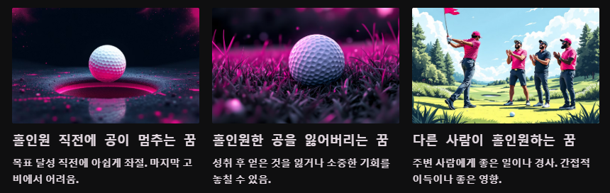 | 홀인원 직전에 공이 멈추는 꿈 | 목표 좌절, 아쉬움, 마지막 고비. | 흉몽 |