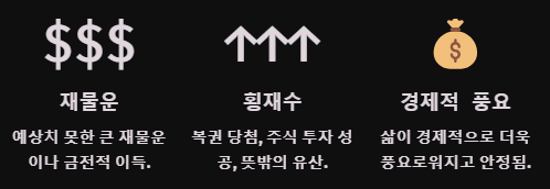 복권 당첨, 주식 투자 성공, 혹은 뜻밖의 유산 등 생각지도 못한 곳에서 큰 재물이 들어올 수 있음을 나타냅니다. 당신의 삶이 경제적으로 더욱 풍요로워지고 안정될 징조입니다.