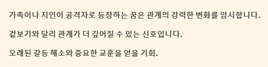 | 나를 죽이려는 사람이 가족/지인인 꿈 | 관계 변화/심화, 갈등 해소, 중요한 계기. | 길몽 |