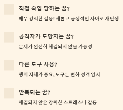 | 나를 죽이려는 시도에 공포 느끼는 꿈 | 불안감, 스트레스 (극복 가능성 높음). | 혼재/경고 |