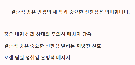 | 내가 결혼하는 꿈 | 인생의 새 단계 진입, 중요한 결정, 긍정적 발전. | 길몽 |