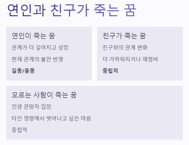 | 연인이 죽는 꿈 | 관계 변화, 감정적 성장 | 길몽/흉몽 |