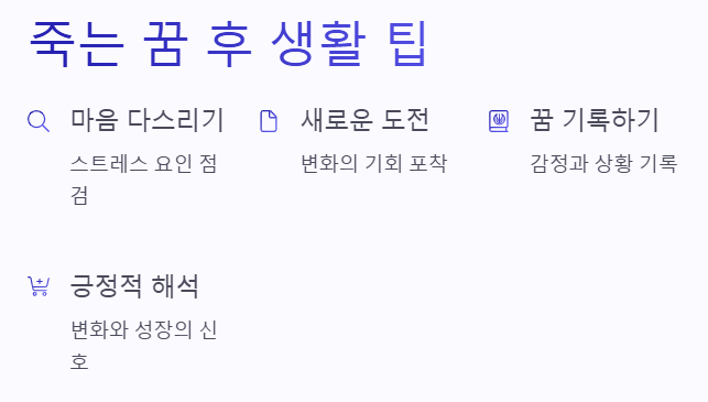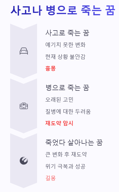 | 사고로 죽는 꿈 | 갑작스러운 변화, 스트레스 누적 | 흉몽 |