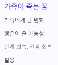 | 가족이 죽는 꿈 | 가족 관계 개선, 행운 도래 | 길몽 |
