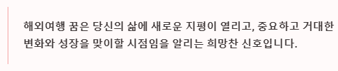 | 해외여행 중 길을 잃는 꿈 | 방향 고민, 혼란 (새로운 발견 기회). | 혼재/경고 |