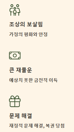 | 돌아가신 조부모님이 돈을 주는 꿈 | 오랜 소원 성취, 집안 경사, 가문의 행운. | 길몽 |