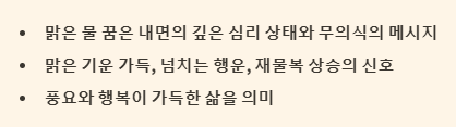 | 맑은 물이 넘쳐흐르는 꿈 | 재물운 상승, 만사형통, 풍요와 번영. | 길몽 |