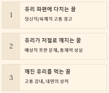 | 유리 파편에 찔리거나 다치는 꿈 | 정신적/육체적 고통, 관계 갈등, 손실 (경고). | 흉몽 |