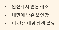 겉으로는 문제가 해결된 듯 보이지만, 내면 깊숙이 여전히 해결되지 않은 감정이나 찝찝함이 남아있을 수 있습니다. 이 꿈은 당신이 완벽한 해소를 위해 더 깊이 내면을 들여다볼 필요가 있음을 알려줍니다.