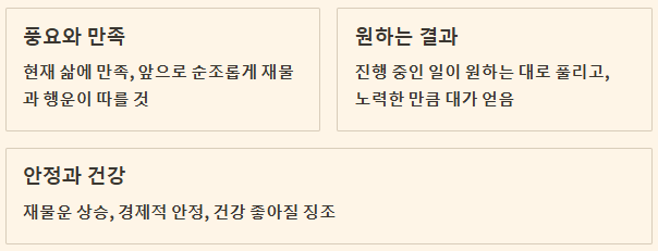 진행 중인 일이 원하는 대로 풀리고, 노력한 만큼의 대가를 얻게 될 것입니다. 재물운이 상승하여 경제적으로 안정을 찾고, 건강 또한 좋아질 징조입니다. 심리적으로도 편안하고 행복한 시기를 맞이할 것입니다.