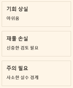 현재 진행 중인 일이나 투자를 신중하게 검토하고, 결정을 미루는 것이 현명할 수 있습니다. 사소한 실수로 큰 손해를 볼 수도 있으니 주의를 기울여야 할 시기입니다.