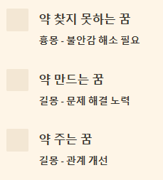 | 약을 만드는 꿈 | 문제 해결 노력, 새로운 계획 준비 | 길몽 |