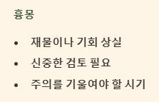 현재 진행 중인 일이나 투자를 신중하게 검토하고, 결정을 미루는 것이 현명할 수 있습니다. 사소한 실수로 큰 손해를 볼 수도 있으니 주의를 기울여야 할 시기입니다.