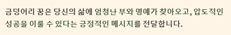 | 금덩어리가 녹는 꿈 | 재물 손실, 사업 실패, 권력 상실 (경고) | 흉몽 |