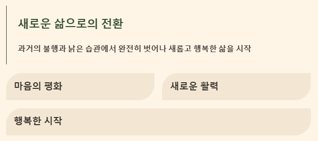 오랫동안 당신을 짓눌렀던 무거운 마음의 짐이 사라지고, 훨씬 자유롭고 편안한 마음을 느끼게 될 거예요. 새로운 활력과 함께 개인적인 삶의 성장이 시작될 징조입니다.