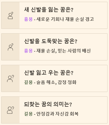 | 새 신발을 잃어버리는 꿈 | 새로운 재물/기회 손실 (경고) | 흉몽 |
