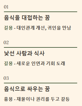 | 맛있는 음식을 먹는 꿈 | 목표 달성, 풍요로운 삶 | 길몽 |