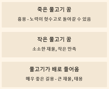 | 물고기가 배로 들어오는 꿈 | 큰 재물이나 태몽으로 해석 | 길몽 |