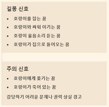 | 호랑이가 죽어 있는 꿈 | 사업 실패, 권력 상실 (경고) | 흉몽 |