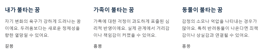 | 동물이 불타는 꿈 | 감정 억압 또는 상실감 | 흉몽 |