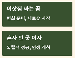 | 이삿짐을 푸는 꿈 | 새로운 환경에 안정적으로 정착하게 됨 | 길몽 |