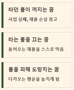 타는 불을 끄는 꿈 | 들어오려는 재물이나 행운을 스스로 막게 됨 (경고) | 흉몽 |