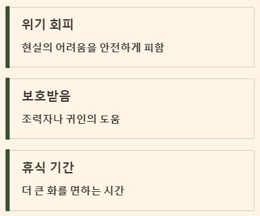 | 비를 피해 숨는 꿈 | 위기를 회피하고 안전하게 보호받음 | 길몽 |