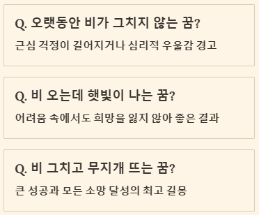 | 오랫동안 비가 그치지 않는 꿈 | 근심 걱정이 길어지거나 우울증을 겪음 (경고) | 흉몽 |
