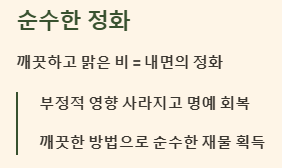 | 맑고 깨끗한 비가 내리는 꿈 | 순수한 재물 획득, 명예 회복 | 길몽 |