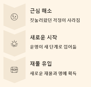 이는 당신의 재정적인 문제나 심리적인 압박감이 말끔히 사라지고, 그 자리를 새로운 재물과 명예가 채우게 될 것을 보여줍니다. 출산이 순조로울수록 일의 해결도 빠를 것입니다.
