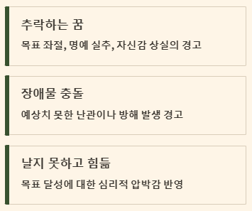 | 날다가 추락하는 꿈 | 목표 좌절, 명예 실추, 자신감 상실 (경고) | 흉몽 |