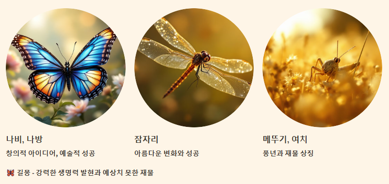 특히 나비나 잠자리와 같은 아름다운 곤충은 창의적인 아이디어나 예술적 성공을, 메뚜기나 여치는 풍년과 재물을 상징하여 당신의 숨겨진 잠재력과 회복력을 보여줍니다.