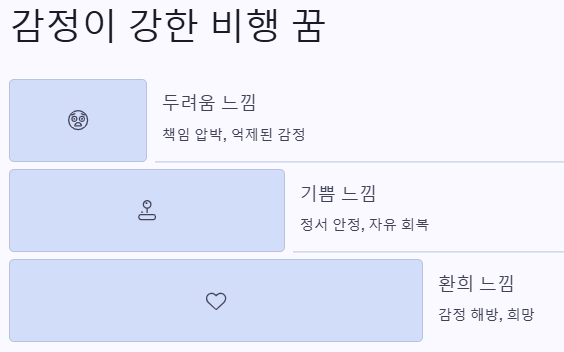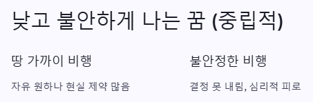 | 날며 두려움 느낌 | 책임 압박, 억제된 감정 | 흉몽 |