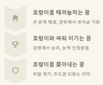 | 호랑이를 쫓아내는 꿈 | 위협을 제거하고 주도권을 되찾는 의미예요 | 길몽 |