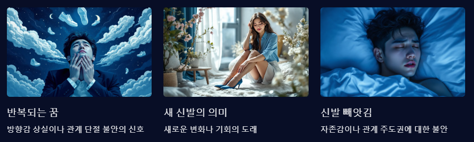 오늘은 이처럼 일상적인 소재이면서도 상징이 풍부한 '신발 꿈해몽'에 대해 이야기해보려 해요. 신발을 잃어버리는 꿈, 신는 꿈, 남에게 주거나 받는 꿈처럼 자주 등장하는 상황들을 중심으로, 그 속에 담긴 무의식의 메시지를 해석해 드릴게요. 각각의 꿈이 길몽인지 흉몽인지, 그리고 심리적으로 어떤 상태를 반영하고 있는지 함께 정리해 보겠습니다.