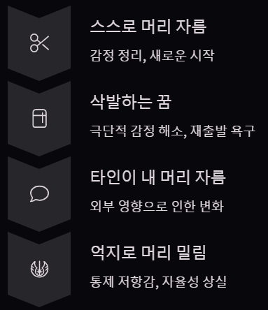 하지만 동시에 빠진 머리를 정리하거나 새로운 머리를 다듬는 장면은 감정 회복과 새로운 정체성에 대한 갈망을 드러내는 좋은 기회일 수도 있어요.