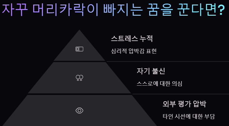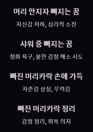 - 머리카락이 빠지는 장면은 불안감과 자존감 저하가 상징적으로 표현된 경우가 많아요.