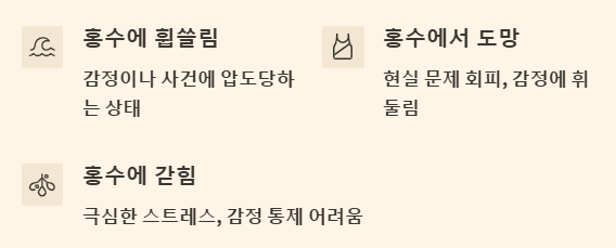 홍수는 감정의 범람, 예상치 못한 사건, 통제할 수 없는 환경을 의미합니다.