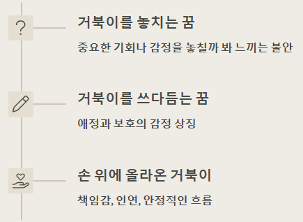 반대로 거북이가 멀어지거나 사라지는 장면은 놓치고 싶지 않은 무언가에 대한 불안을 표현할 수 있어요. 이럴 땐 무언가를 억지로 붙잡기보단 흐름을 차분히 관찰하며 판단을 유보하는 게 좋을 수 있어요.