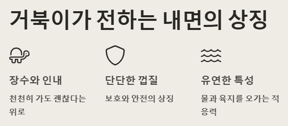 거북이는 전통적으로 장수와 인내, 보호의 상징으로 여겨졌어요. 꿈에서 거북이를 마주했다는 건 단순히 귀엽거나 느린 동물을 만난 게 아니라, 무의식이 내게 건네는 ‘천천히 가도 괜찮다’는 위로일 수 있어요. 단단한 껍질, 느린 걸음, 물과 육지를 오가는 유연한 특성은 현실에서 내가 느끼는 불안, 조급함, 혹은 지치고 있는 마음 상태를 반영하기도 하죠.