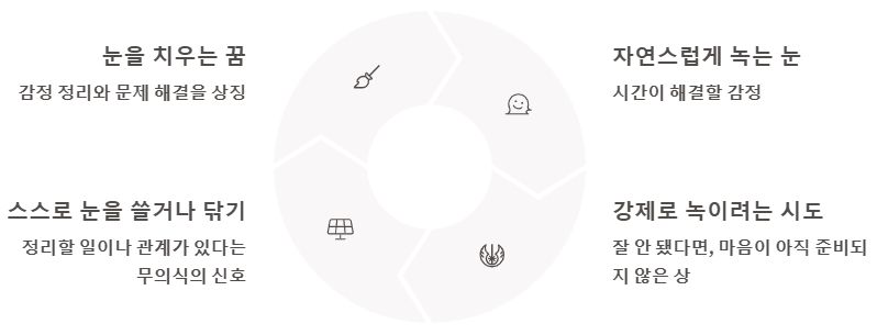 눈을 치우거나 녹이는 꿈은 감정 정화, 문제 해결, 혹은 마음 정리의 과정을 상징해요. 특히 스스로 눈을 쓸거나 닦고 있었다면, 지금 현실에서 정리해야 할 일이나 관계가 있다는 무의식의 메시지일 수 있어요.