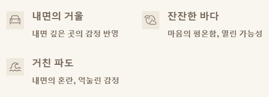 특히 밀물과 썰물의 반복은 관계에서의 거리 조절, 혹은 어떤 일에 대한 열정과 회피가 교차되는 마음을 나타낼 수 있어요. 파도가 어느 방향으로 흐르고 있었는지, 그 흐름 속에서 내가 어떤 감정을 느꼈는지가 중요해요.