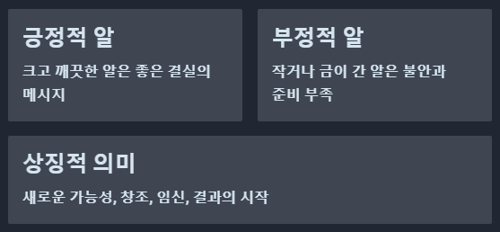 | 알이 작거나 금간 상태의 꿈 | 불안정한 기대, 준비 부족에 대한 무의식의 반응 | 흉몽 |