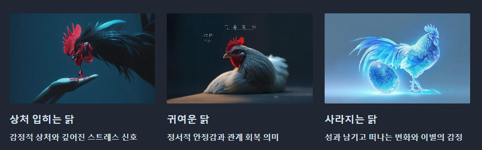닭이 유독 인상 깊게 다가왔다면, 지금 내가 자신을 지켜야 할 필요성을 느끼고 있거나, 주변에서 내 이름이 거론되고 있는 상황일 수 있어요. 닭의 울음, 움직임, 색깔 하나하나에 무의식이 반응한 것일 수도 있죠.