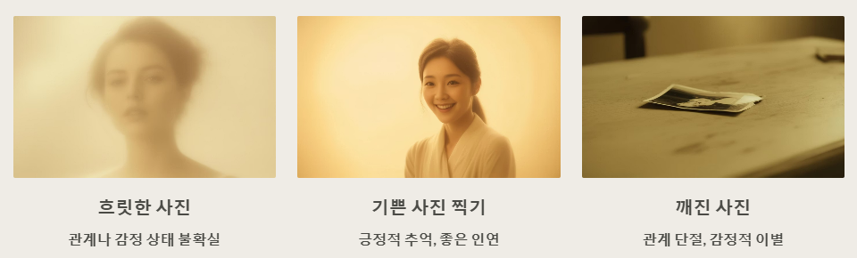 사진은 꿈에서 과거의 감정 기록, 현재 감정의 포착, 또는 관계에 대한 인식을 의미해요. 또한 잊고 싶지 않은 감정이나 놓치기 싫은 순간, 때로는 후회하거나 놓쳐버린 과거를 상징하기도 해요.